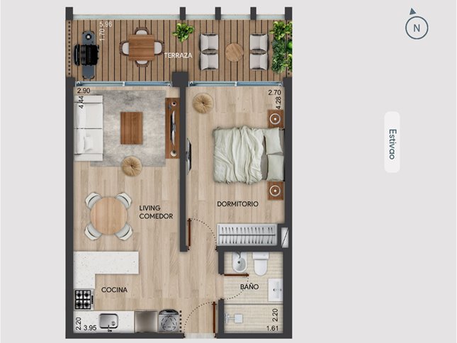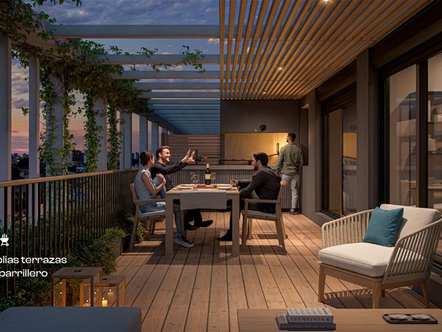 Las unidades de 1 dormitorio cuentan con living-comedor con salida a terraza, cocina definida y baño completo. Algunas tipologías incluyen terrazas más amplias o con parrillero propio, adaptándose a diferentes estilos de vida y necesidades de espacio. Las superficies totales van desde los 49 m² hasta más de 56 m², con opciones al frente o al contrafrente abierto.