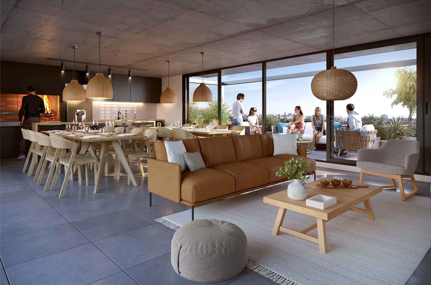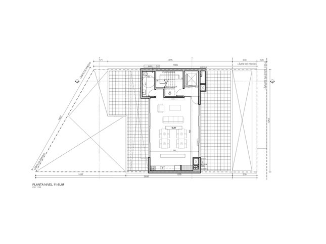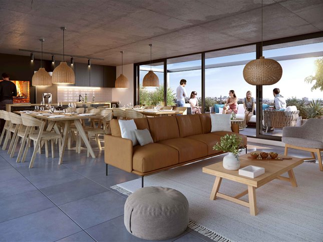 Además cuenta con un SUM ubicado en el nivel 11. Este espacio está diseñado para reuniones y actividades sociales, e incluye un área cerrada con sector de estar, comedor y cocina integrada con barra y muebles bajo mesada. Dispone de parrillero, amplios ventanales corredizos y acceso a una terraza exterior equipada con mobiliario y vegetación ornamental.