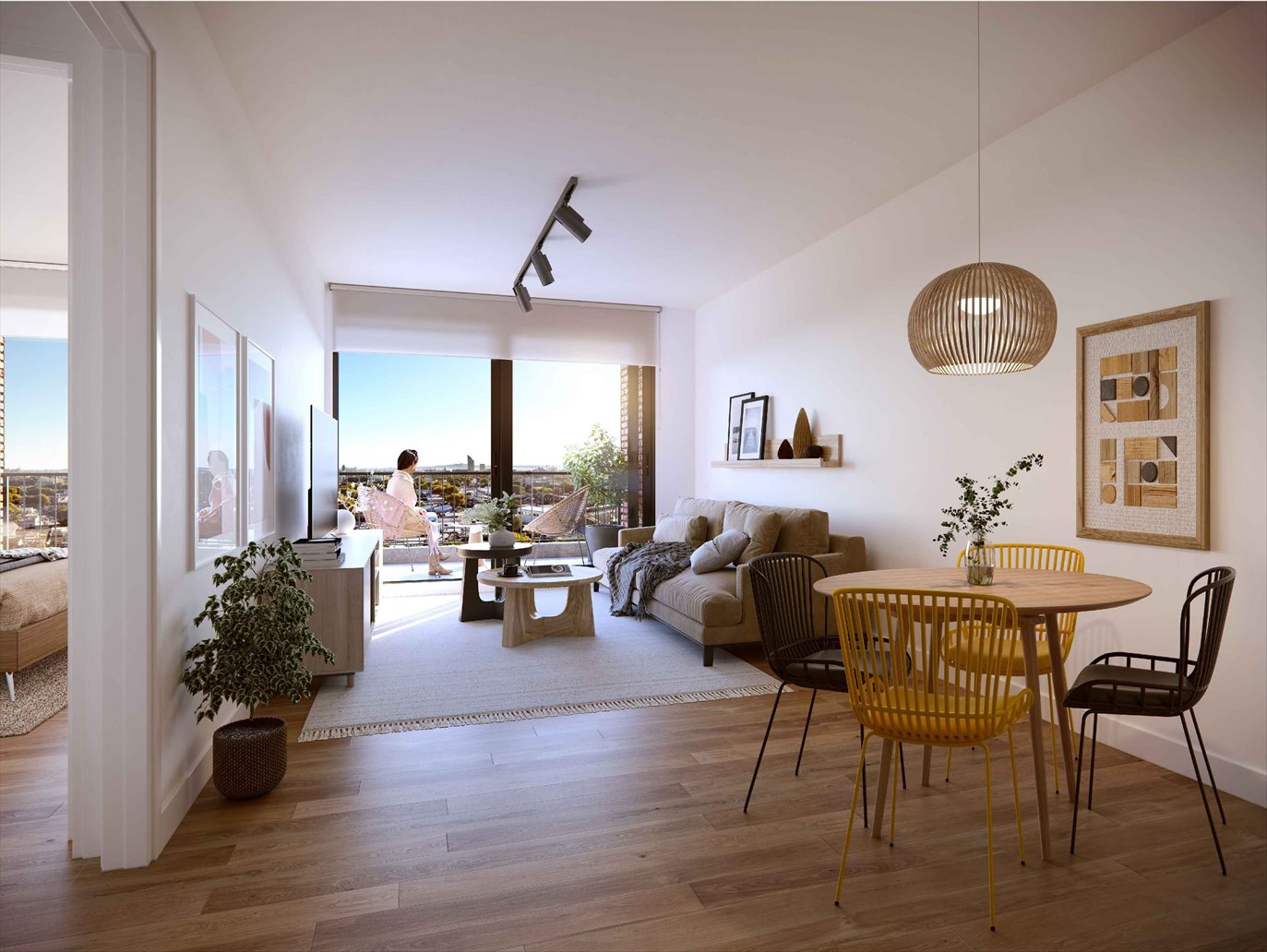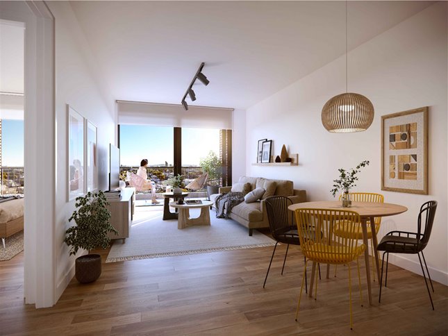 Las superficies de las unidades oscilan entre 55 m² y 64 m² y cuentan con estar-comedor, cocina (independiente o semi-integrada según tipología), baño completo y dormitorio. Varias disponen de terraza o balcón con baranda de aluminio. Las cocinas incluyen previsión para lavarropas y calefón. La distribución de los apartamentos varía según su ubicación en la planta, con cuatro unidades por piso en los niveles 2 al 9, tres unidades en el nivel 10 y cuatro en el nivel 1.