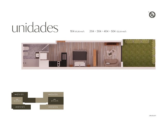 Metrajes monoambientes disponibles: desde 32m2 hasta 43m2.